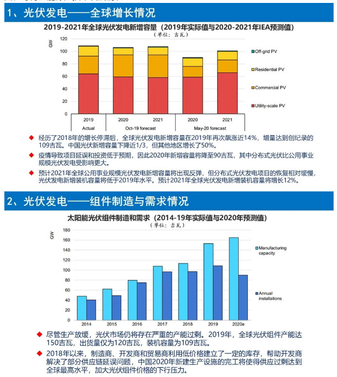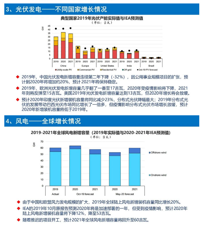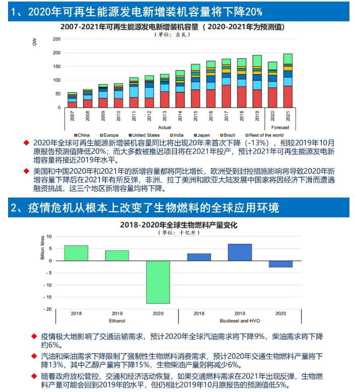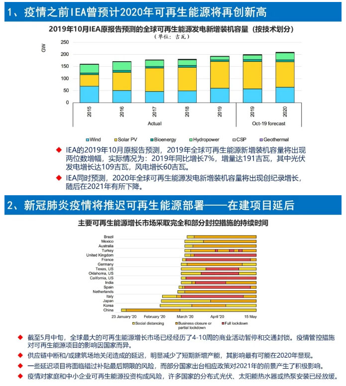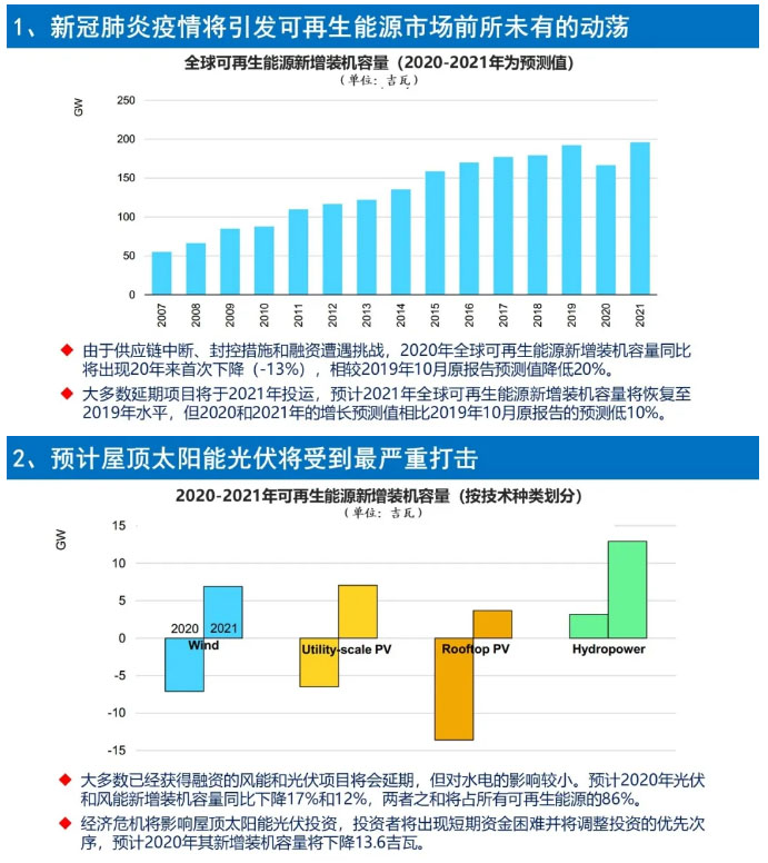 近期,國際能源署(IEA)更新了其去年10月發(fā)布的可再生能源市場報告,分析了新冠肺炎疫情對可再生能源市場的影響,重新預(yù)測了2020-2021年全球可再生能源裝機(jī)情況,針對各可再生能源技術(shù)的發(fā)展進(jìn)行了具體分析,并提出了2021年后可再生能源發(fā)展面臨的挑戰(zhàn)和機(jī)遇。主要內(nèi)容如下: