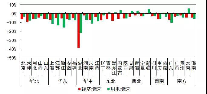 疫情嚴(yán)重地區(qū)、經(jīng)濟(jì)發(fā)達(dá)省份受到明顯波及,經(jīng)濟(jì)和用電出現(xiàn)大幅下滑。一季度,全國(guó)31個(gè)省份中30個(gè)省份GDP負(fù)增長(zhǎng),其中湖北下降39.2%,上海、廣東、北京、山東、浙江、江蘇分別下降6.7%、6.7%、6.6%、5.8%、5.6%、5.0%;31個(gè)省份中24個(gè)省份用電量負(fù)增長(zhǎng),主要集中于中東部地區(qū),其中處于疫情中心的湖北增速最低(-22.2%),浙江(-15.8%)、江蘇(-13.2%)、上海(-11.7%)、廣東(-10.4%)、山東(-6.5%)等經(jīng)濟(jì)發(fā)達(dá)地區(qū)用電增速均低于全國(guó)平均水平。