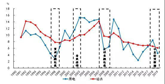 圖1 1990-2019年我國(guó)GDP與全社會(huì)用電量增速對(duì)比