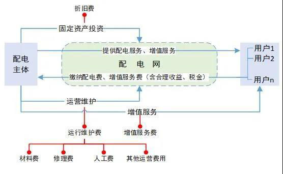 配網(wǎng)運(yùn)營(yíng)商在建設(shè)期和運(yùn)營(yíng)期會(huì)發(fā)生固定資產(chǎn)投資(如變電站、開閉所、配電線路、用戶專項(xiàng)工程等),在運(yùn)營(yíng)期需要對(duì)配電資產(chǎn)進(jìn)行日常運(yùn)營(yíng)和維護(hù),同時(shí)對(duì)電力用戶提供增值服務(wù)、繳納增值稅等,整個(gè)過程都會(huì)產(chǎn)生成本和費(fèi)用。電力用戶為其享受的配電服務(wù)和增值服務(wù)所發(fā)生的成本買單,配電主體通過向用戶收取配電費(fèi)、增值服務(wù)費(fèi)彌補(bǔ)成本并獲得合理收益。增值服務(wù)費(fèi)與用戶享受的增值服務(wù)水平有關(guān),由配網(wǎng)運(yùn)營(yíng)商向電力用戶單獨(dú)額外收取,不計(jì)入配電定價(jià)成本。