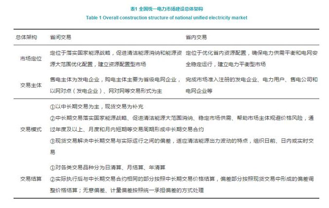 1)“統(tǒng)一市場(chǎng)、兩級(jí)運(yùn)作”的全國(guó)電力市場(chǎng)總體框架基本建成[9]??傮w架構(gòu)如表1所示,省間交易和省內(nèi)交易的功能定位日漸清晰。以中長(zhǎng)期交易為主、現(xiàn)貨交易為補(bǔ)充的市場(chǎng)模式基本形成各界共識(shí)。目前,省間、省內(nèi)中長(zhǎng)期電力交易機(jī)制已全部建立,以消納清潔能源為主的省間現(xiàn)貨交易也已開(kāi)展。統(tǒng)一框架設(shè)計(jì)、統(tǒng)一核心規(guī)則、統(tǒng)一運(yùn)營(yíng)平臺(tái)、統(tǒng)一服務(wù)規(guī)范的全國(guó)統(tǒng)一電力市場(chǎng)建設(shè)基本方法在實(shí)踐中發(fā)揮了很好的作用。