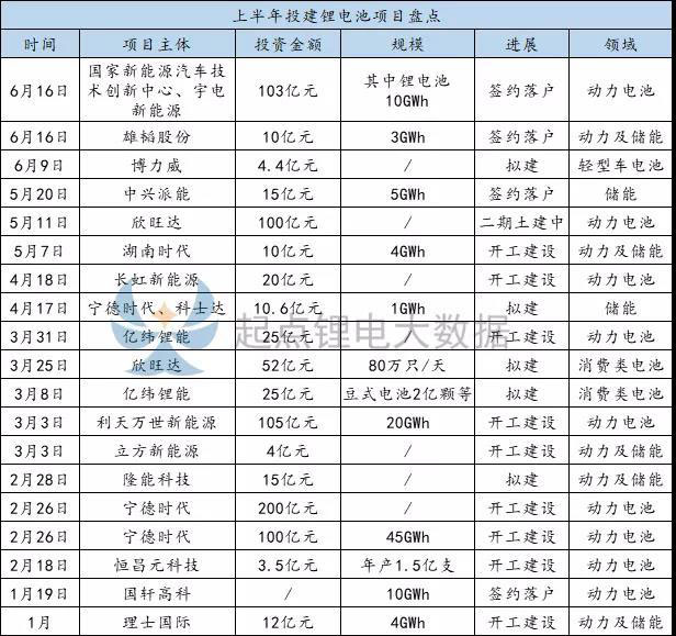 據起點鋰電大數據不完全統(tǒng)計,今年上半年超過20個鋰電池項目落地或投產,涉及投資金額超過810億元,包括動力電池、消費類電池、儲能電池等,具體如下: