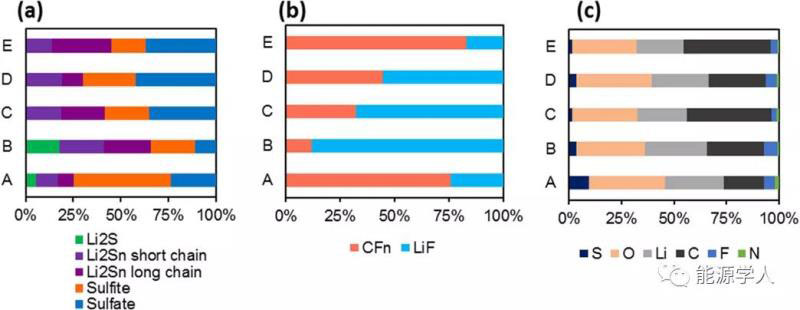 對(duì)測(cè)試的S-KB正極進(jìn)行的測(cè)試后SEM分析表明,所有樣品的微觀結(jié)構(gòu)變化非常?。▓D6)。單個(gè)碳顆粒在形貌上無(wú)變化且無(wú)厚的表面層(例如CEI或再沉積(聚)硫化物或S),可能與多孔KB顆粒非常高的外表面積和相對(duì)較小的電極負(fù)載有關(guān)(圖6)。鋰負(fù)極(圖7a-c)一側(cè),在循環(huán)后出現(xiàn)了顯著的變化。圖7d、7e顯示了2C放電結(jié)束時(shí),鋰片的EDS結(jié)果。與低濃度和高濃度電解質(zhì)相比,1M電解質(zhì)產(chǎn)生最大強(qiáng)度的N、F和S,表明最大的硫溶解和最厚的SEI形成。LiTFSI、LiPF6混合電解質(zhì)的F強(qiáng)度比0.1M LiTFSI電解質(zhì)的F強(qiáng)度大,這是由LiPF6分解產(chǎn)生的額外F引起的。