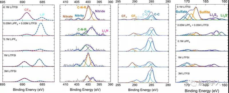 與1M和3M號(hào)電解質(zhì)相比,低濃度電解質(zhì)的含氮化合物比含氮有機(jī)化合物多。這可能是由于在低濃度電解質(zhì)中LiNO3的相對(duì)比例較高。只有0.1M LiTFSI同時(shí)具有CF2和CF3鍵,而所有電解質(zhì)都顯示出C–C、C–H、C–O和C=O鍵,這與二氧環(huán)烷溶劑的分解和聚合一致。