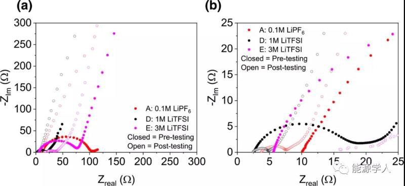 對(duì)比長(zhǎng)循環(huán)前后的EIS結(jié)果(圖5),發(fā)現(xiàn)0.1M電解質(zhì)的阻抗降低幅度最大。然而,3M電解質(zhì)在循環(huán)后表現(xiàn)出最大的阻抗和最大的界面電阻。
