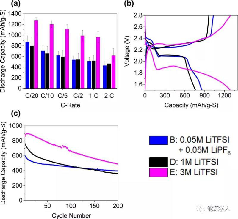 該研究工作將兩種常見(jiàn)的電解質(zhì)鹽LiTFSI和LiPF6,在低濃度下進(jìn)行組合,結(jié)果表明它們的組合產(chǎn)生的容量與傳統(tǒng)的1M LiTFSI電解質(zhì)相當(dāng)。與最初的預(yù)期相反,將電解液濃度從1M降低到0.2M并沒(méi)有增加鋰負(fù)極上的多硫化物溶解和Li2S沉積。事實(shí)上,倍率和長(zhǎng)循環(huán)測(cè)試都顯示低濃度電解質(zhì)的性能與標(biāo)準(zhǔn)1M電解質(zhì)相似或更好。其次,低濃度電解質(zhì)能夠?qū)崿F(xiàn)更低的成本和更高的能量密度,因此,對(duì)其可進(jìn)一步深入研究。