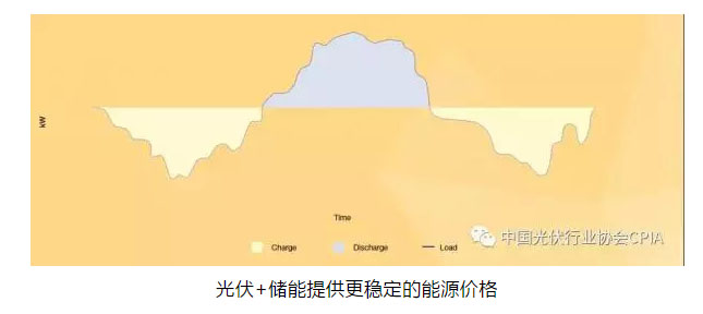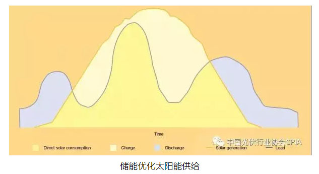 太陽能供給曲線(黃色)是變量,與傳統(tǒng)電力需求曲線(藍色)僅部分保持一致,將光伏+儲能相結合可以儲存多余電量(白色區(qū)域),當用戶需求過高時(藍色區(qū)域),可以將儲存的太陽能電量運送回輸電網(wǎng),最大限度的利用儲能的技術潛力。