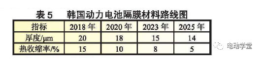 隔膜材料路線圖在隔膜的厚度和熱收縮率方面提出要求,到2025年隔膜的厚度將降低至14pm,熱收縮率降至5%。表5為韓國動力電池隔膜材料路線圖。