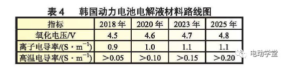 電解液路線圖提出要開發(fā)高電壓?穩(wěn)定性好的電解液材料,在氧化電壓?電導(dǎo)率方面設(shè)定目標(biāo),到2025年電解液的氧化電壓將達(dá)到4.8V。電導(dǎo)率δ(S/m),與電阻率ρ(Ω·m)呈倒數(shù)關(guān)系。表4為韓國動力電池電解液材料路線圖。