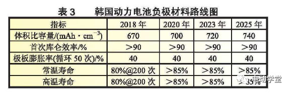 負(fù)極材料路線圖提出要開發(fā)硅碳負(fù)極材料以及金屬系負(fù)極材料,改善循環(huán)壽命,到2025年負(fù)極的體積比容量將達(dá)到740mAh/cm3。表3為韓國動力電池負(fù)極材料路線圖。