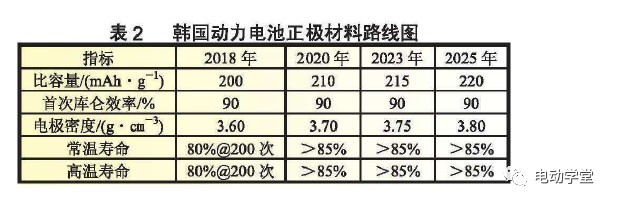 正極材料路線圖提出要開發(fā)能量密度高?穩(wěn)定性能好的正極材料,到2025年正極材料的比容量將達(dá)到220mAh/g。表2為韓國動力電池正極材料路線圖。