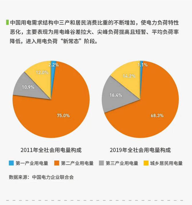 “新冠疫情沖擊中國用電需求,雖然經(jīng)濟總體呈復(fù)蘇態(tài)勢,但短期用電需求仍將持續(xù)走低。”《報告》第一作者袁家海教授說,“全球疫情導(dǎo)致的出口受阻和制造業(yè)產(chǎn)能下滑,會拉低基礎(chǔ)用電負荷水平,而依靠‘新基建’拉動電力需求又存在滯后性;同時,服務(wù)業(yè)用電需求的回暖、數(shù)字經(jīng)濟的發(fā)展和城鄉(xiāng)居民用電量的增長都會繼續(xù)拉高用電峰荷。因而,“十四五”期間中國大概率會出現(xiàn)負荷峰谷差進一步拉大的情況?!?