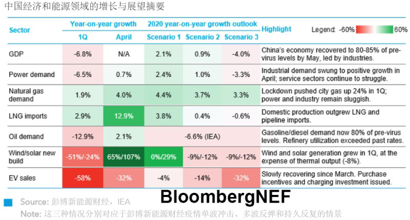 疫情爆發(fā)后,中國能源市場的需求在2月降至冰點,目前似乎出現(xiàn)恢復態(tài)勢。除新能源汽車銷量外,彭博新能源財經(jīng)追蹤的其他主要指標4月均出現(xiàn)同比正增長。今年下半年市場前景仍取決于國內(nèi)刺激政策和第二波疫情防控措施的有效性,以及中國出口市場的恢復程度。