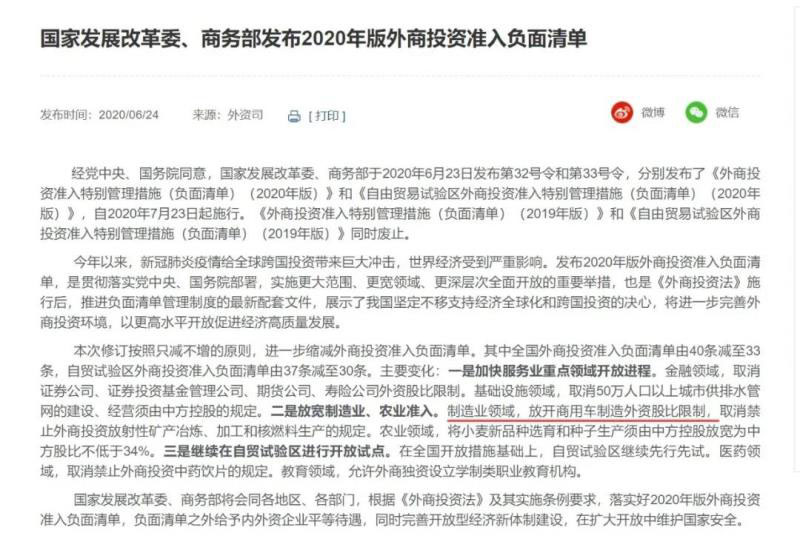 6月24日,國家發(fā)改委、商務(wù)部聯(lián)合發(fā)布《外商投資準(zhǔn)入特別管理措施(負(fù)面清單)(2020年版)》和《自由貿(mào)易試驗(yàn)區(qū)外商投資準(zhǔn)入特別管理措施(負(fù)面清單)(2020年版)》,將于2020年7月23日起施行。兩文件再次明確,在制造業(yè)領(lǐng)域放開商用車制造外資股比限制。