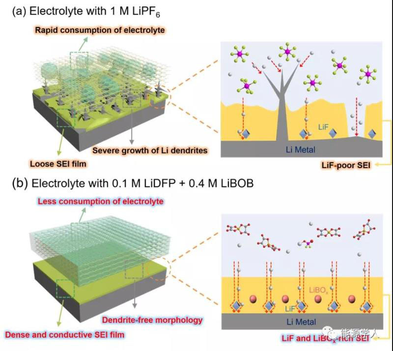 以低濃度LiDFP-LiBOB雙鹽電解液為例,如圖7所示,通過富含LiF和LiBOx組分的SEI膜調(diào)控,在鋰金屬表面構(gòu)筑致密、高穩(wěn)定性SEI膜,一方面抑制了鋰枝晶的生長(zhǎng),另一方面減少了電解液在循環(huán)過程中的消耗,保證了低濃度電解液也在鋰金屬電池中良好的綜合性能表現(xiàn)。