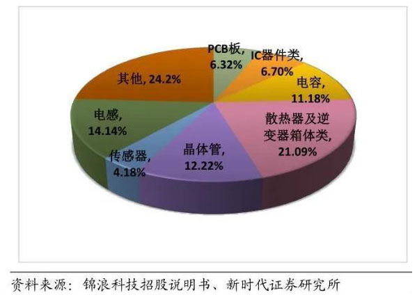 以錦浪科技和固德威為例進(jìn)行成本拆分。光伏逆變器生產(chǎn)所需的主要材料包括機(jī)構(gòu)件、電子元器件以及輔助材料等。其中機(jī)構(gòu)件主要為塑膠件、壓鑄件、鈑金件、散熱器等;電子元器件包括功率半導(dǎo)體器件、集成電路、電感、PCB線路板、電容、開(kāi)關(guān)器件、連接器等;輔助材料主要包括膠水、包材、絕緣材料等。以錦浪科技和固德威為代表,原材料成本拆分如下: