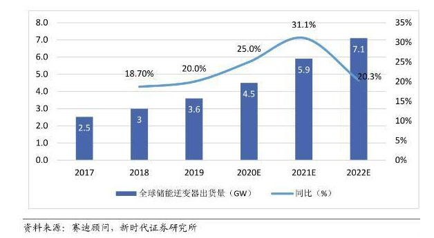 預(yù)計(jì)2022年儲(chǔ)能逆變器出貨量達(dá)7.1GW。間歇性發(fā)電特征是制約光伏拓展市場(chǎng)的瓶頸之一,儲(chǔ)能逆變器作為保障連續(xù)電力供應(yīng)的首選解決方案,同時(shí)受惠成本下降及政策支持,正在成為傳統(tǒng)逆變器廠家的一個(gè)新的戰(zhàn)略先手。2019年,全球儲(chǔ)能逆變器出貨量上升至3.6GW,同比2018年增長(zhǎng)20%。預(yù)計(jì)到2022年底,全球儲(chǔ)能逆變器需求將達(dá)到7.1GW,市場(chǎng)前景不容小覷。