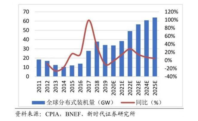 全球分布式市場(chǎng)蓬勃發(fā)展,2025年預(yù)計(jì)新增裝機(jī)64GW。根據(jù)BNEF數(shù)據(jù)顯示,2011-2019年全球新增光伏裝機(jī)量CAGR為19.4%,2019年裝機(jī)量達(dá)到120GW,其中分布式光伏34.1GW。2018年由于“531”光伏新政出臺(tái),淘汰落后中小企業(yè)產(chǎn)能,行業(yè)加速出清,國(guó)內(nèi)新增光伏裝機(jī)量44.3GW,同比下降16.4%。2019年光伏競(jìng)價(jià)政策出臺(tái)較晚、項(xiàng)目建設(shè)時(shí)間短,國(guó)內(nèi)光伏新增裝機(jī)再度下降至30.1GW,同比下降32%,其中地面電站和工商業(yè)項(xiàng)目顯著收縮,分布式光伏裝機(jī)量上升。未來(lái)隨著國(guó)內(nèi)外疫情逐步穩(wěn)定,產(chǎn)業(yè)復(fù)工復(fù)產(chǎn),預(yù)計(jì)2025年光伏新增裝機(jī)量可達(dá)到205GW,其中分布式預(yù)計(jì)新增64GW。