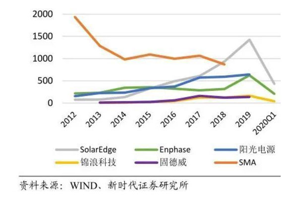 圖2:各家光伏逆變器按季度營(yíng)收情況(百萬(wàn)美元)