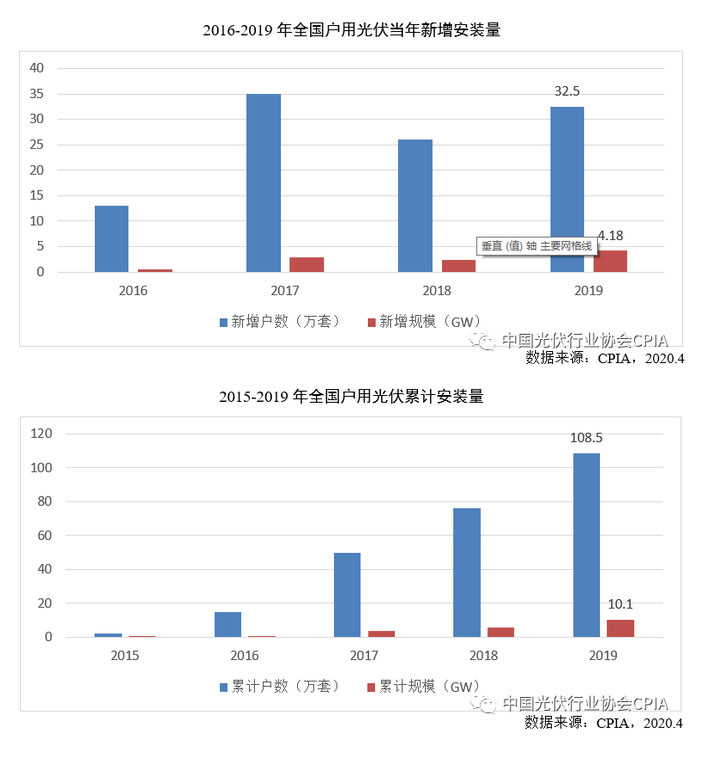 2019年,戶用光伏成為新增裝機(jī)中的亮點(diǎn)。根據(jù)國(guó)家能源局公布的數(shù)據(jù),2019年戶用光伏項(xiàng)目納入規(guī)模管理指標(biāo)中的新增裝機(jī)規(guī)模為5.29GW,其中包含2018年并網(wǎng)但未納入當(dāng)年國(guó)家規(guī)模管理的項(xiàng)目規(guī)模約為1.11GW,2019年實(shí)際新增裝機(jī)規(guī)模為4.18GW,同比增長(zhǎng)74.2%。通過協(xié)會(huì)的調(diào)研數(shù)據(jù)測(cè)算,截至2019年底,戶用光伏項(xiàng)目累計(jì)裝機(jī)規(guī)模突破10GW,達(dá)到10.1GW;2019年全國(guó)戶用光伏項(xiàng)目新增戶數(shù)約為32.5萬套,同比增長(zhǎng)約25%,累計(jì)安裝戶數(shù)超過百萬套,達(dá)到108.5萬套。