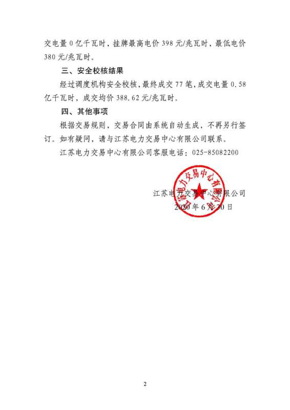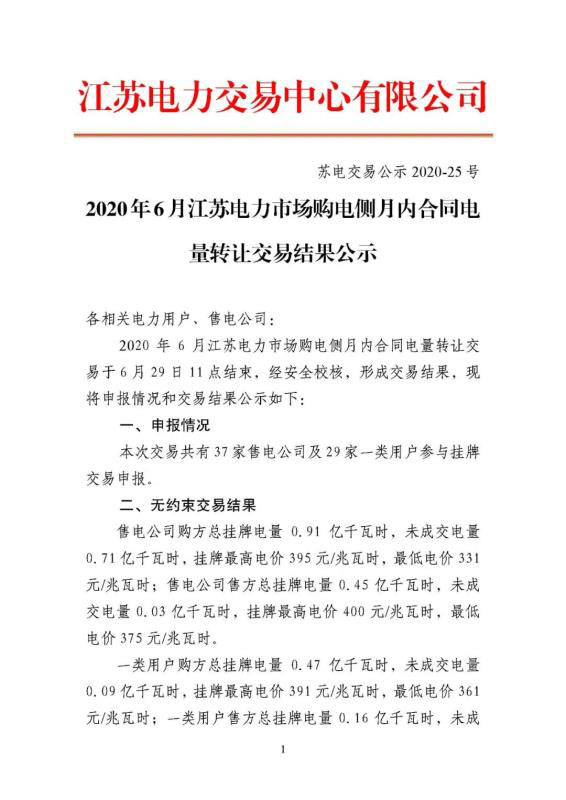 2020年6月江蘇電力市場購電側(cè)月內(nèi)合同電量轉(zhuǎn)讓交易結(jié)果公示