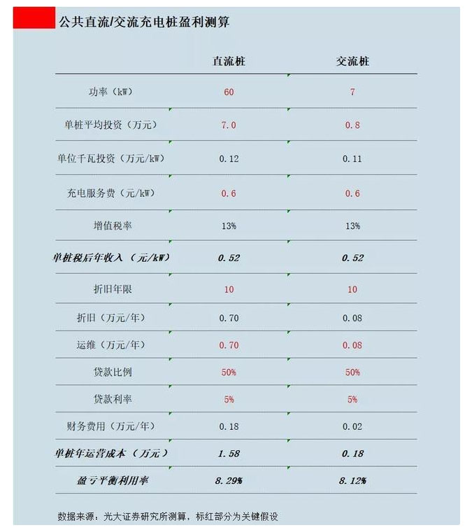 光大證券數(shù)據(jù)顯示,要達到典型的60kW直流樁和7kW交流樁的盈虧平衡點時的充電利用率,分別需要 8.29%和 8.12%。