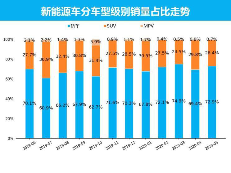 從整體新能源市場(chǎng)銷量情況來看,2020年5月,新能源車共銷售了6.0萬輛,占整個(gè)市場(chǎng)銷量的3.8%。與上個(gè)月相比,新能源車銷量環(huán)比增長24.7%;與去年同期相比,新能源車銷量同比下跌29.1%,不過去年6月銷量猛增,是受到了新能源補(bǔ)貼調(diào)整影響。