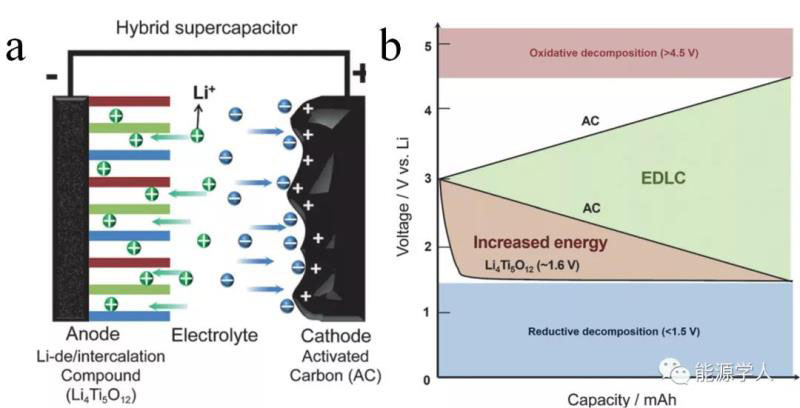 圖8. (a) 混合超級(jí)電容器電化學(xué)反應(yīng)機(jī)理。(b) 雙電層電容器和混合超級(jí)電容器中負(fù)極和正極典型的電化學(xué)曲線。相對(duì)于鋰金屬,電解液的氧化和還原分解分別發(fā)生在高于4.5 V和低于1.5 V的電壓下。
