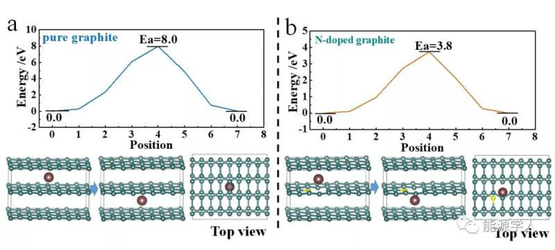 圖6. 能量分布和相應(yīng)的Li+通道構(gòu)型:(a)純石墨層,(b)N摻雜石墨表面缺陷層