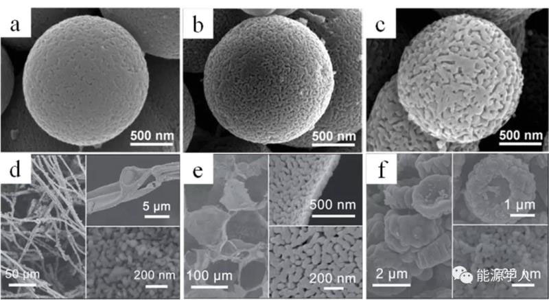 圖5. TiNb2O7的各種納米結(jié)構(gòu):(a-c) 0D、(d) 1D、(e)2D、(f) 3D結(jié)構(gòu)