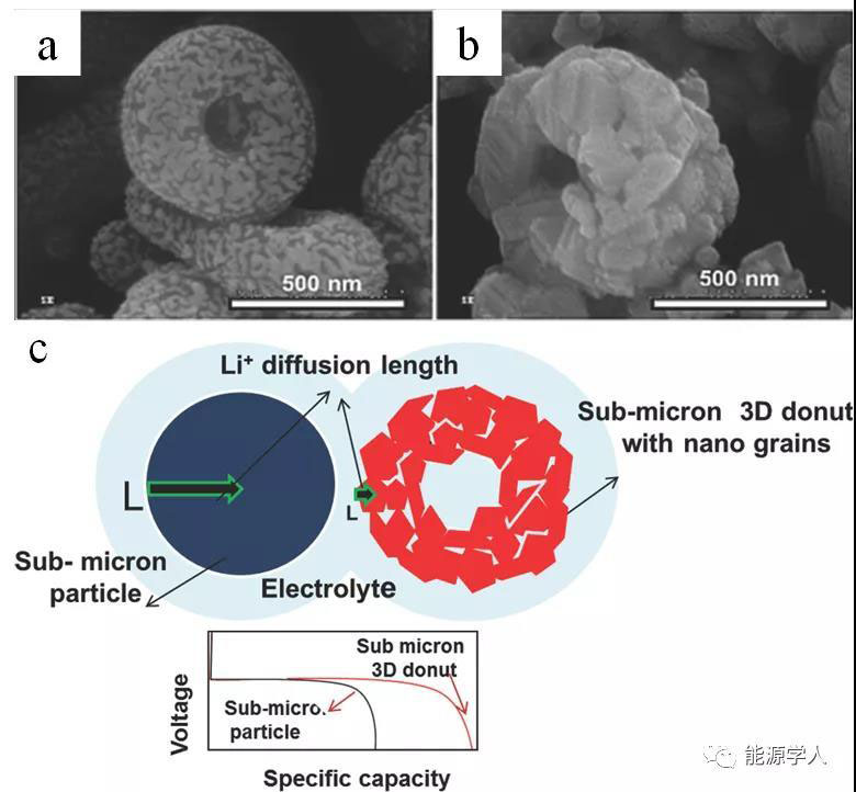 圖4. (a), (b) 甜甜圈形Li4Ti5O12SEM圖,(c) 鋰離子擴(kuò)散動(dòng)力增強(qiáng)示意圖。