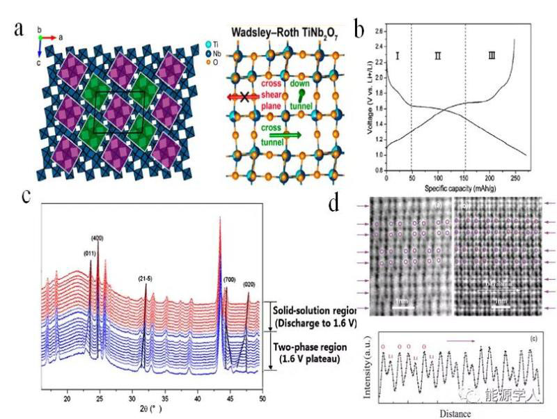 Goodenough于2011年率先研究了TiNb2O7作為鋰離子電池Ti-Nb-O(TNO)負(fù)極材料,理論容量是Li4Ti5O12的兩倍,為387.6 mAh g-1。TNO化合物屬于單斜切ReO3型晶體結(jié)構(gòu),其分層結(jié)構(gòu)沿[010]晶帶軸分布,如圖2a所示。如圖2d所示,Chen等使用環(huán)形明亮場(ABF)掃描透射電子顯微鏡(STEM)研究了TiNb2O7中鋰離子的嵌入和脫嵌機(jī)理。鋰離子沿著[010]晶帶軸的1D通道被存儲(chǔ)在(001)平面上。當(dāng)四個(gè)Li+嵌入TiNb2O7中形成Li4TiNb2O7時(shí),晶胞體積將擴(kuò)大9.2%。ReO3的剪切結(jié)構(gòu)在鋰離子的嵌入/脫出過程中可以基本保持不變,因此具有出色的結(jié)構(gòu)穩(wěn)定性。