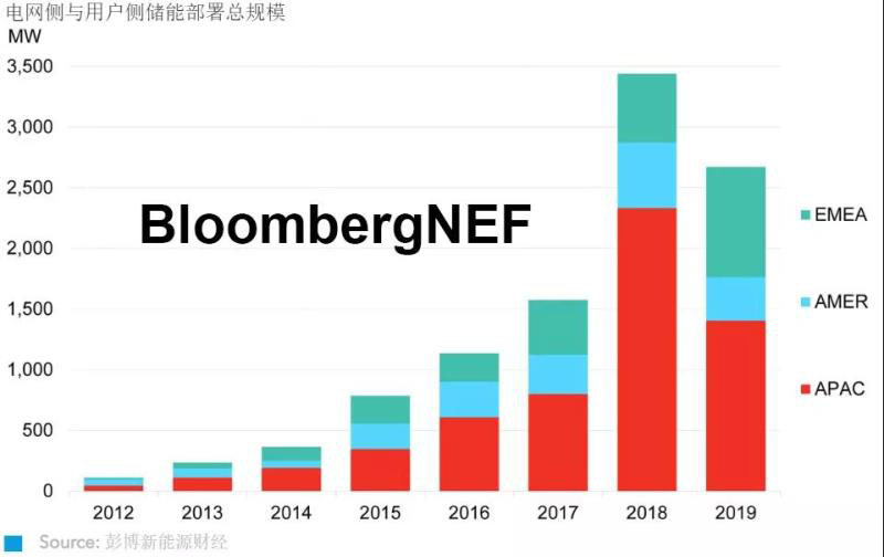 2019年,全球儲(chǔ)能新增裝機(jī)規(guī)模為2.7GW / 5.5GWh,電網(wǎng)側(cè)與用戶側(cè)儲(chǔ)能平分秋色。日本和德國(guó)戶用儲(chǔ)能銷售蓬勃發(fā)展,成為支撐儲(chǔ)能系統(tǒng)裝機(jī)規(guī)模的重要支柱。