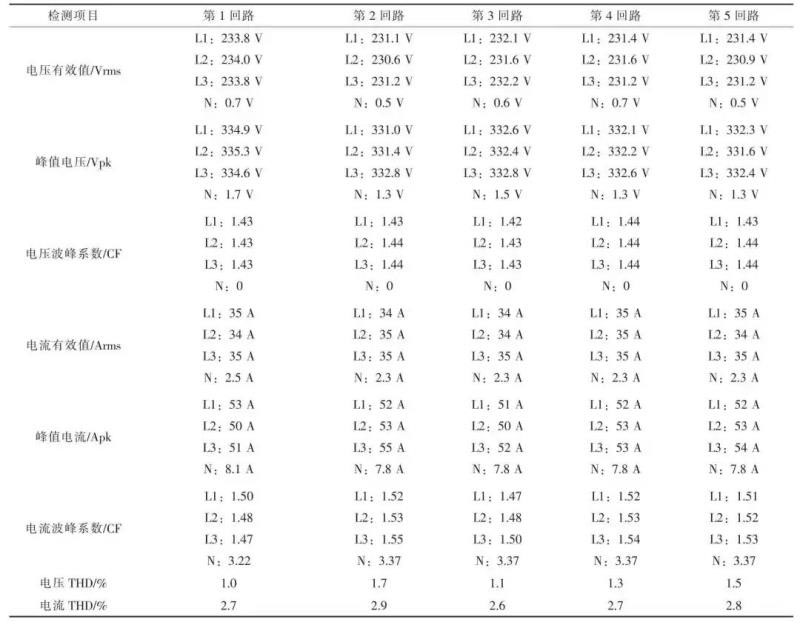 電能質(zhì)量是評價某個電網(wǎng)或某個供電點電能質(zhì)量優(yōu)劣的主要方法[12]。儲能電站運行期間,利用電能質(zhì)量分析儀對儲能變流器交流側充放電時的電能質(zhì)量進行檢測,檢測項為電流電壓的有效值、電流電壓峰值、諧波、不平衡等。經(jīng)實測,各回路充放電時的電能質(zhì)量均在國家標準規(guī)定范圍內(nèi),儲能電站各回路25 kW 放電電能質(zhì)量測試數(shù)據(jù)(部分)見表5。