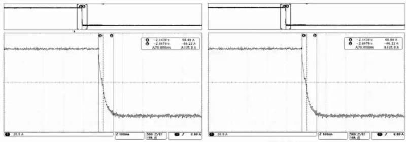調(diào)度響應成功率主要包含電站自動化系統(tǒng)響應時間及設備響應時間,電站自動化系統(tǒng)數(shù)據(jù)采用Modbus TCP 通信協(xié)議傳輸,通信介質(zhì)為超6類屏蔽雙絞線,通信響應時間小于1 ms。檢測方式在每回路直流側增設電流分配器,對儲能變流器進行等功率充放電切換,通過采集電流分配器電壓信號判斷儲能變流器充放電切換時間,充放電功率以5 kW 為一個遞增量,一般在80 ms 以內(nèi),其數(shù)值在國標規(guī)定的范圍內(nèi)。第1 回路30 kW 充放電切換波形如圖15 所示。