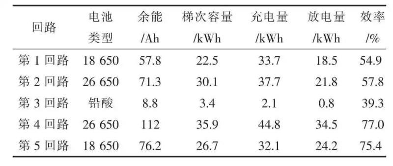 依據(jù)表2 的數(shù)據(jù),對退役動力電池的應用得到了初步結論,5 個回路的容量保持率分別是35.2%,52.8%,14.6%,89.8%和83.4%;各回路容量在電站總容量所占的百比例分別為17.7%,21.9%,2.6%,34.4%和23.4%。