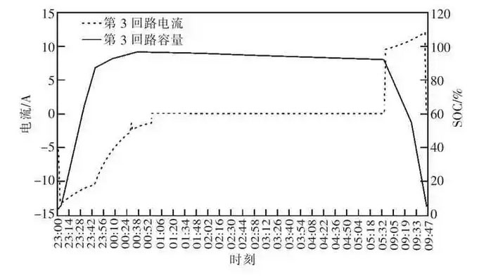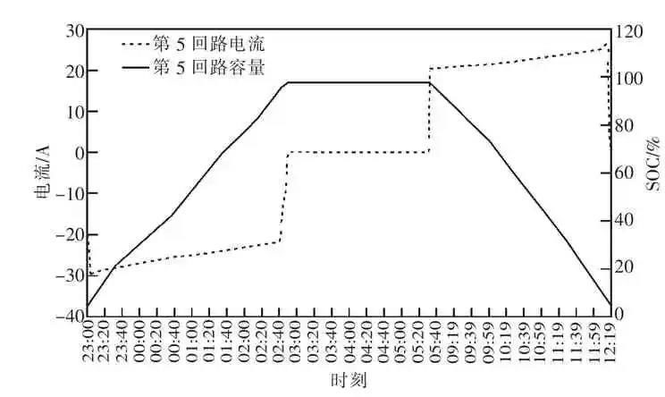 電站各回路按照恒功率的控制方式,各回路充放電的功率分別是6.4 kW,5.7 kW,5 kW,10 kW 和8 kW。在充放電過程中,各回路配置BMS 進行保護,為了安全起見,電芯間壓差過大或過溫等情況下,BMS 將進行保護,因此,各回路電池容量并沒有完全充滿或放空。各回路充放電設定的功率是恒定的,電壓則不斷變化,根據(jù)公式I=P/U,PCS 不斷地調(diào)節(jié)電流以達到恒功率充放電的目的。依照圖9—13 可知,在初始和結束階段會以一個較小的電流進行充放,起到激活和保護電池的作用;整個充放電過程中,各回路的退役電池不會出現(xiàn)“一充就飽,一放就了”的情況,放電功率不會隨電池的容量降低而下降。