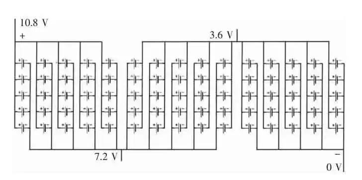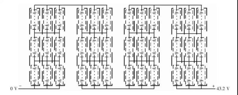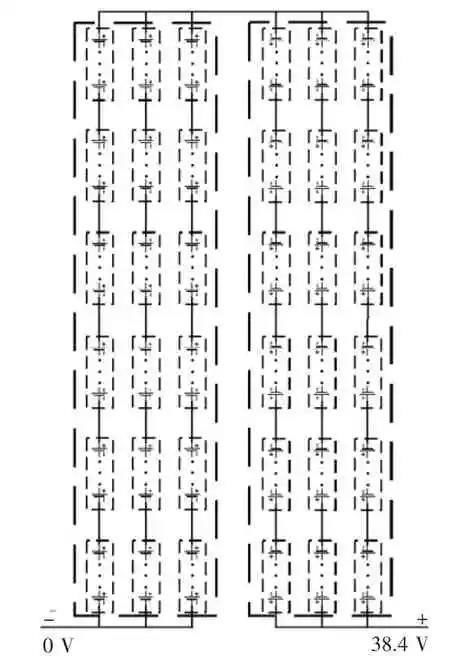 (1)第1 回路:選擇2015 年退役電動汽車的電池包,將其拆解至電芯,篩選重組成模組,電芯類型是18650,標稱電壓為3.6 V,標稱容量為2.2 Ah;模組結構25P3S,電池箱內(nèi)裝12個模組,電池組由9 個電池箱(共8 100 只電芯)串接構成,模組及電池箱電氣連接如圖3 和4 所示。