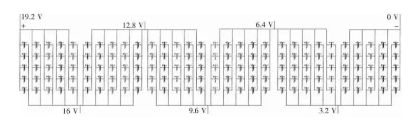 (2)第2 回路:選擇2015 年退役電動汽車的電池包,拆解至電芯,篩選重組成模組,電芯類型是26650,標稱電壓為3.2 V,標稱容量為2.7 Ah;模組結構15P6S,電池箱內(nèi)裝6 個模組,電池組由11 個電池箱(共5 940 只電芯)串接構成,模組及電池箱電氣連接如圖5 和6 所示。