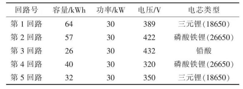 儲能電站由退役動力電池、儲能PCS(變流器)、BMS(電池管理系統(tǒng))、EMS(能源管理系統(tǒng))等組成,為了體現(xiàn)儲能電站的異構兼容特征,電站選用5 種不同類型、結構、時期的退役動力電池進行儲能(為突出“異構”特色,系統(tǒng)還選用一路退役的鉛酸蓄電池)。