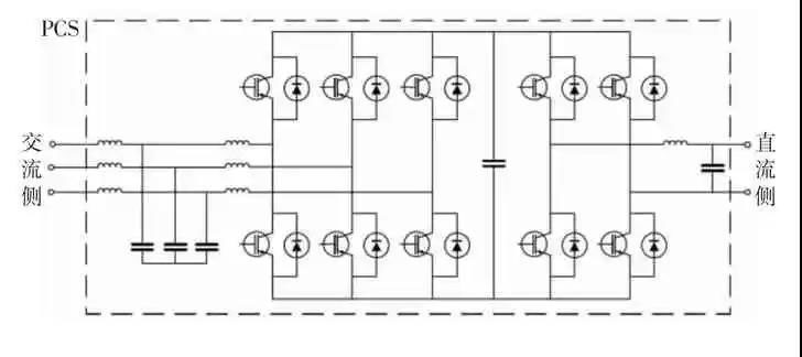 為實現(xiàn)儲能電站的控制,需要電站中各設備間進行有效的配合與數(shù)據(jù)通信,電站數(shù)據(jù)通信網(wǎng)絡拓撲結構分3 層,分別為現(xiàn)場應用層、數(shù)據(jù)控制層和數(shù)據(jù)調(diào)度層,系統(tǒng)中現(xiàn)場應用層主要是對PCS 和BMS 等數(shù)據(jù)監(jiān)測與控制,系統(tǒng)網(wǎng)絡拓撲結構如圖1 所示。PCS 是直流電池和交流電網(wǎng)連接的中間環(huán)節(jié)[8],是系統(tǒng)能量傳遞和功率控制的中樞,PCS 采用模塊化設計,每個回路的PCS 都可獨立調(diào)節(jié)。系統(tǒng)并網(wǎng)時,PCS 以電流源形式注入電網(wǎng),自鉗位跟蹤電網(wǎng)相位角度;系統(tǒng)離網(wǎng)時,以獨立電壓源方式運行,輸出恒定電壓和頻率供負載使用,各回路主電路拓撲結構如圖2 所示。BMS 具備電池參數(shù)監(jiān)測(如總電流、單體電壓檢測等)、電池狀態(tài)估計和保護等;數(shù)據(jù)控制層嵌入了系統(tǒng)針對不同類型、結構、時期的動力電池控制策略,實現(xiàn)系統(tǒng)充放電功率均衡。數(shù)據(jù)監(jiān)控層即EMS,主要實現(xiàn)儲能電站現(xiàn)場設備中各種狀態(tài)數(shù)據(jù)的采集和控制指令的發(fā)送、數(shù)據(jù)分析和事故追憶。