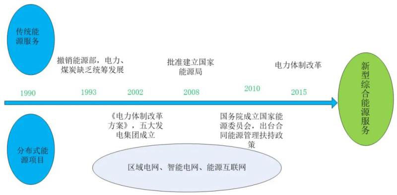 能源服務公司具有強大技術研發(fā)能力和先進技術推廣與擴散能力。開放、競爭、有序的市場才能形成對市場主體產(chǎn)生開發(fā)和推廣新技術的激勵,進步的技術又促使傳統(tǒng)能源品種之間的替代成為可能,進而使綜合能源市場主體能夠在供求之間自由決策。下圖為我國能源服務發(fā)展歷程: