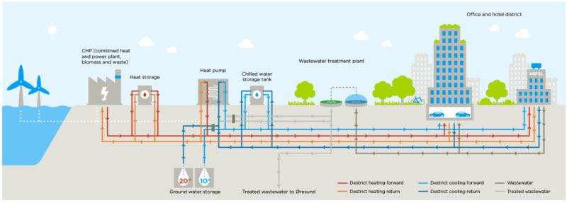 位于大哥本哈根郊區(qū)塔恩比市(Taarnby)卡斯特魯普地鐵站的新城市開發(fā)區(qū),是使用智能耦合的很好例子,首次將區(qū)域供熱與區(qū)域冷卻和廢水結(jié)合起來,為該地區(qū)的社區(qū)和商業(yè)部門提供低碳能源。塔恩比公用事業(yè)公司建立了一個新的區(qū)域供冷系統(tǒng),并擴(kuò)建了現(xiàn)有的區(qū)域供暖系統(tǒng),以取代燃?xì)忮仩t。新的區(qū)域供冷系統(tǒng)包括一個能源站和一個2000立方米的冷凍水儲罐。能源站位于污水處理廠的外圍,可以實現(xiàn)熱電聯(lián)產(chǎn),有4臺熱泵從處理后的污水中提取額外熱量。