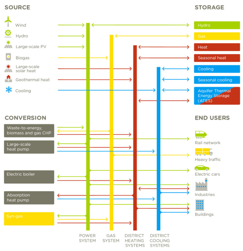 Ramboll公司發(fā)文介紹,能源系統(tǒng)由四個能源載體組成:電力系統(tǒng)、燃?xì)饩W(wǎng)絡(luò)、區(qū)域供熱網(wǎng)絡(luò)和區(qū)域冷卻網(wǎng)絡(luò)。傳統(tǒng)上,這四個能量載體是分開運行的。然而,在綠色能源比例不斷增加的情況下,將四種能源載體的各個要素連接起來并利用它們各自的優(yōu)勢,可以建立起能源系統(tǒng)所需的靈活性。在未來的能源系統(tǒng)中,以智能耦合打通四大能源載體,可提供更清潔、更廉價的能源服務(wù)。