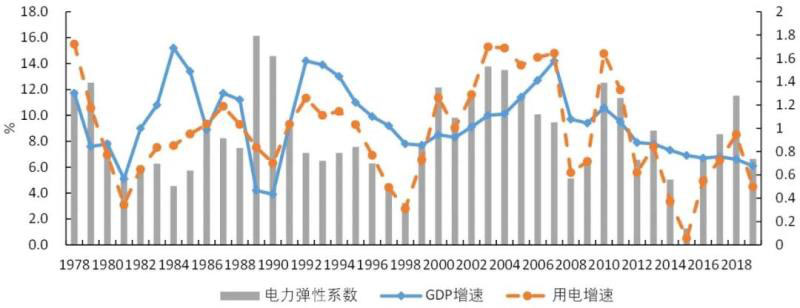 從年度看,電力彈性系數波動較大。1978-2019年,我國年度電力彈性系數最大值為1.79(1989年),最小值為0.14(2015年)。例如,1989年受緊縮調控政策及有關政治事件影響,經濟增速大幅下降,電力彈性系數躍升為1.79;1998年,受亞洲金融危機的影響,GDP增速明顯下降,但電力消費增速下降更顯著,電力彈性系數下降到0.36;2008年,受國際金融危機等影響,電力消費增速大幅下降,電力彈性系數為0.57;2015年,經濟保持平穩(wěn)增長,但鋼鐵、煤炭去產能力度很大,"三去一降一補"等政策措施見效,電力消費增速下降至1%左右,電力彈性系數僅為0.14。因此年度電力彈性系數波動幅度較大,無法用來進行年度電力需求預測,實際應用價值不大。下圖是1978年以來我國電力彈性系數的變化情況。