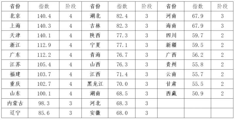 從全國看,工業(yè)化綜合指數超過95,表明我國已處在工業(yè)化后期階段。從各省看,東部沿海除海南、河北外其他各省及西部的重慶均已基本完成工業(yè)化,進入后工業(yè)化階段;東北三省、中部六省、西部的陜西、內蒙古、寧夏、青海以及河北處在工業(yè)化后期;其余八?。ň鶠槲鞑渴》荩┥刑幵诠I(yè)化中期。下表是2018年各省份工業(yè)化綜合指數。