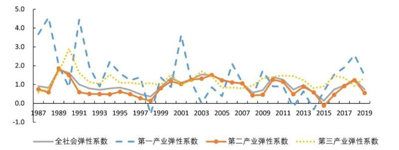 圖2 全社會和三次產業(yè)電力彈性系數變化情況