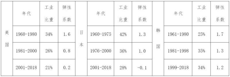 注釋:1、工業(yè)比重是工業(yè)增加值占GDP的比重,為所對應階段的平均值;時間段按照各國經濟增長關鍵節(jié)點劃分。2、數據來自于世界銀行WDI數據庫(2019)、《帕爾格雷夫:世界歷史統(tǒng)計》(美洲卷、亞非和大洋洲卷)、IEA及《韓國電力統(tǒng)計年鑒》(2006)。