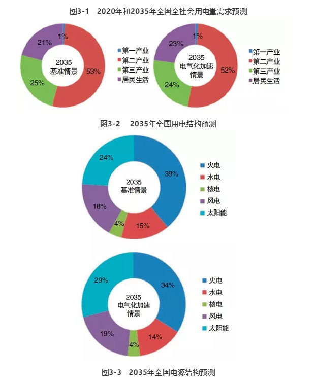 黨的十九大報告明確提出,2035年要基本實(shí)現(xiàn)社會主義現(xiàn)代化,2050年要建成富強(qiáng)民主文明和諧美麗的社會主義現(xiàn)代化強(qiáng)國。據(jù)有關(guān)機(jī)構(gòu)預(yù)測,2035年我國GDP將達(dá)到32萬億美元,年均增速仍將保持4%~5%,城鎮(zhèn)化率將由現(xiàn)在的近60%提升到70%~75%。綜合考慮需求增長、能效提升等因素,預(yù)計2020~2035年我國用電量年均增速在2.7%~3.3%之間,到2035年,我國全社會用電量將達(dá)到11.4~12.4萬億千瓦時,人均用電量、人均生活用電量分別達(dá)到8000、1900千瓦時,發(fā)電能源占比有望達(dá)到57%,終端用電占比達(dá)到38%,與發(fā)達(dá)國家的電氣化水平差距將顯著縮小。