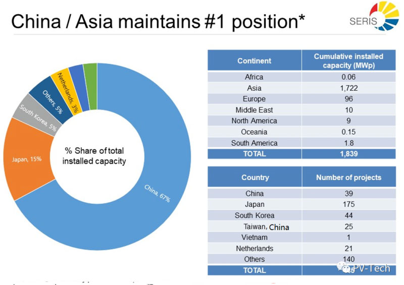 根據(jù)新加坡太陽(yáng)能研究所(SERIS)最新報(bào)告,2019年漂浮光伏項(xiàng)目新增裝機(jī)583兆瓦,到2020年6月全球累計(jì)裝機(jī)1,839兆瓦,而中國(guó)大陸占比67%。